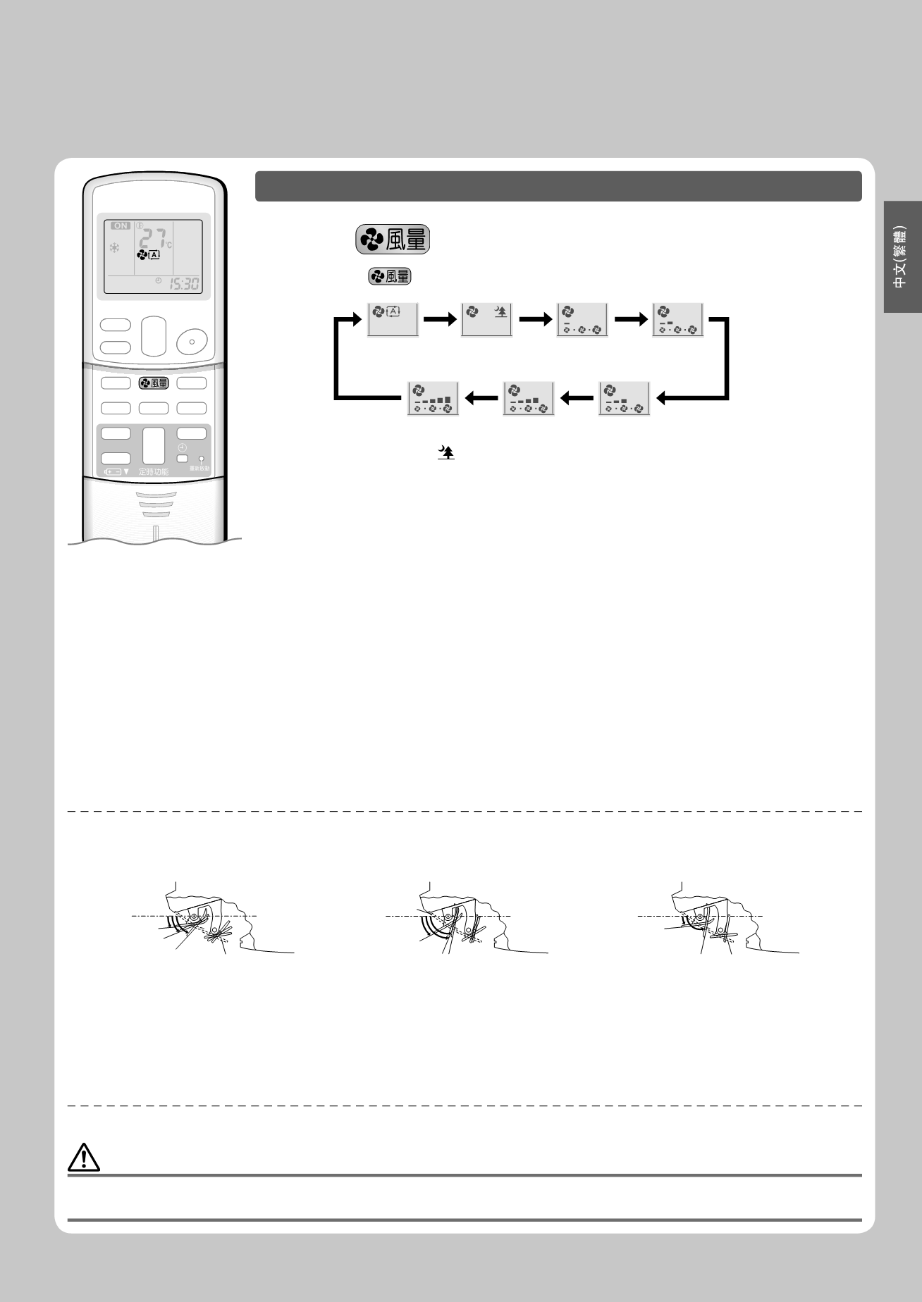 上下葉⽚和左右葉⽚⾵向的調節,必須⽤遙控器進⾏。如果正在擺動時,強制⽤⼿操作上下葉⽚和左右葉⽚,機械裝置可能會損壞。