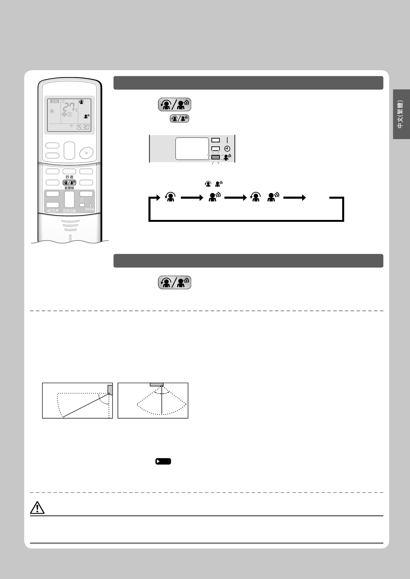 感應器的反應感度因室內機的安裝位置、⼈的移動速度或周圍溫度的不同等⽽異。