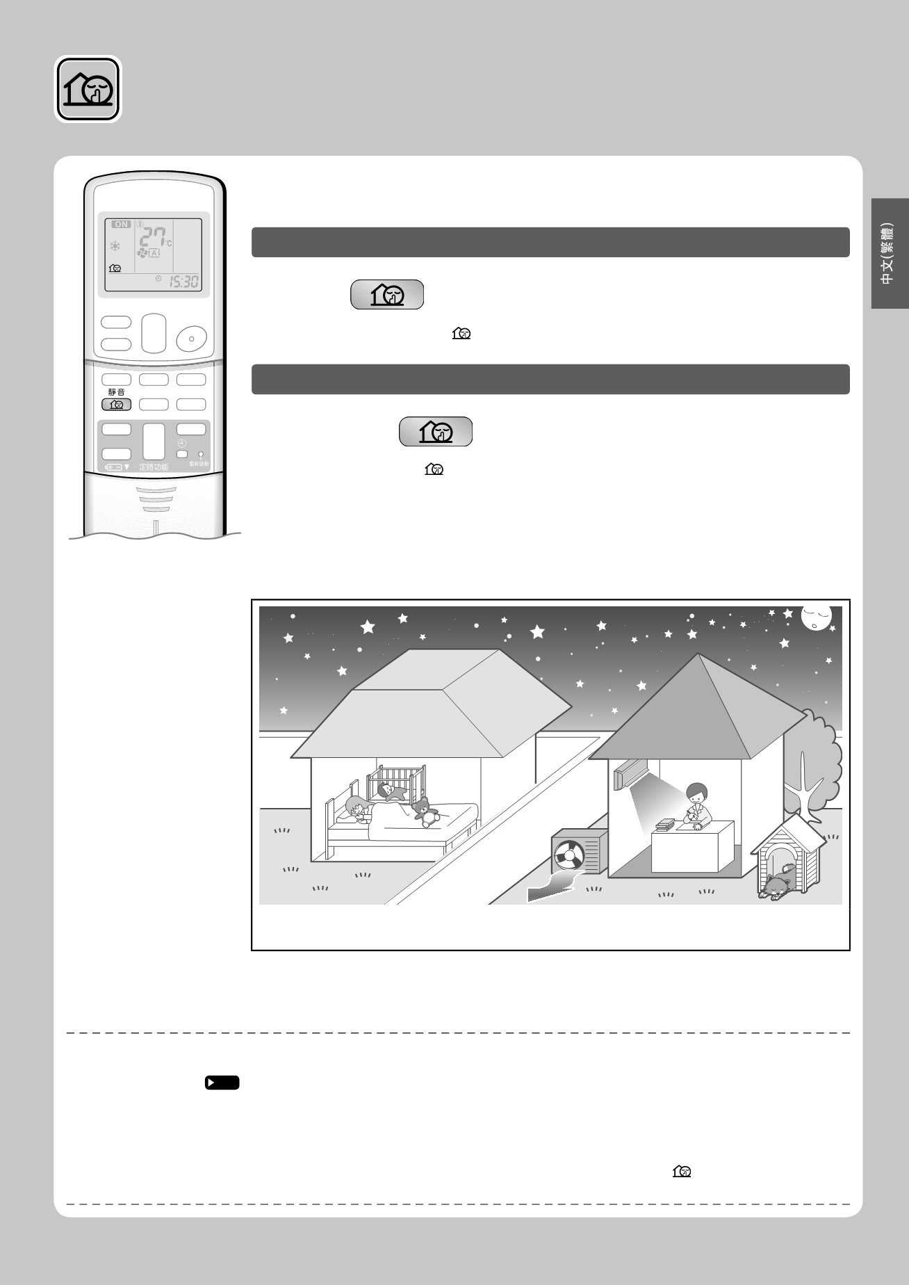 多聯系統時,只有在所有運轉中的室內機上均設定這個功能,室外機靜⾳運轉才能發揮作⽤。然⽽,當進⾏了主控房間設定時,請詳讀多聯系