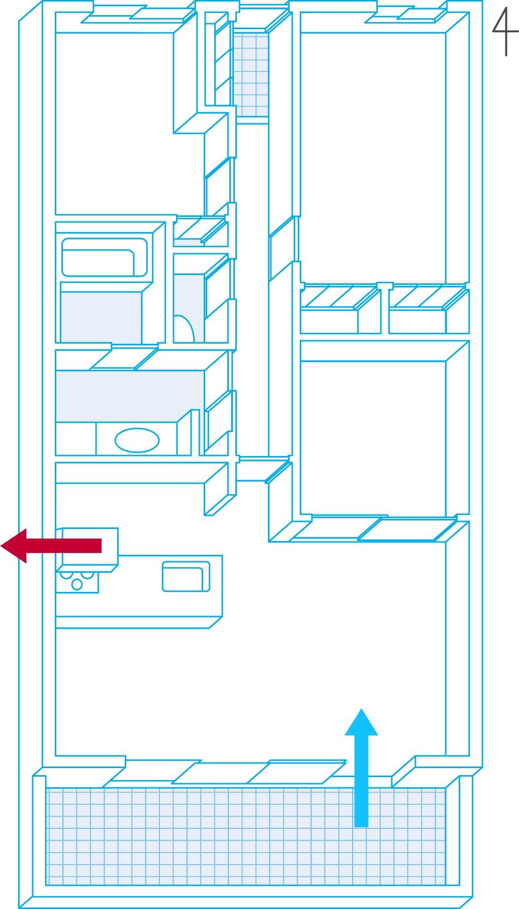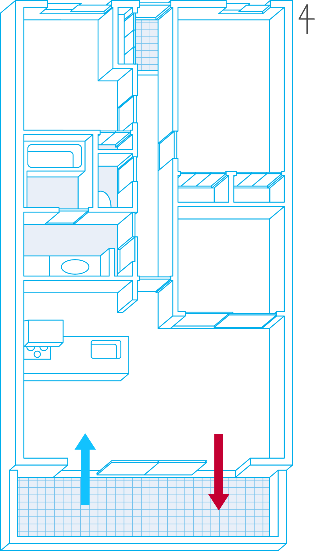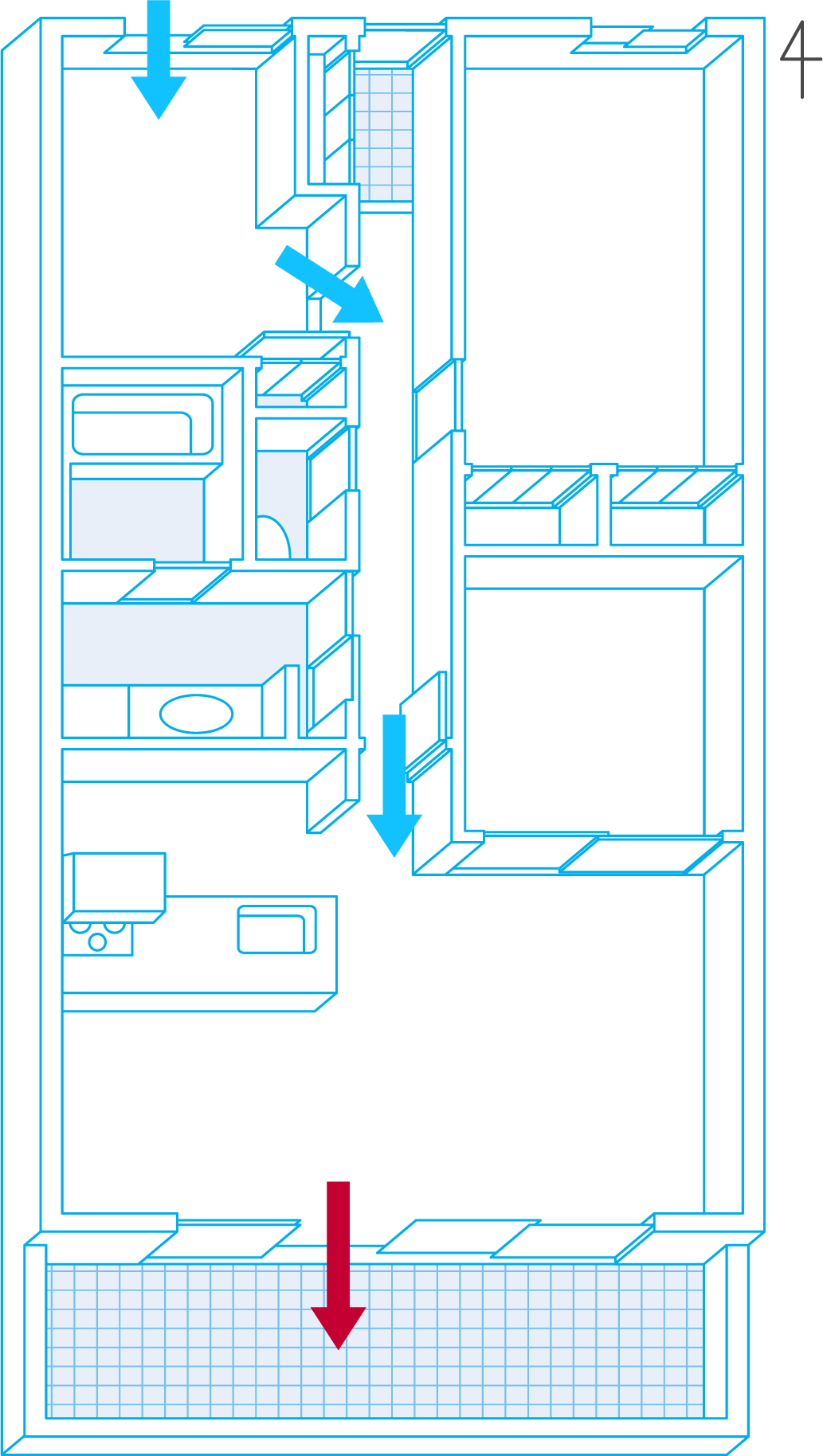 打開入口側和陽台側的窗戶,並確保沿著空氣通道打開門。