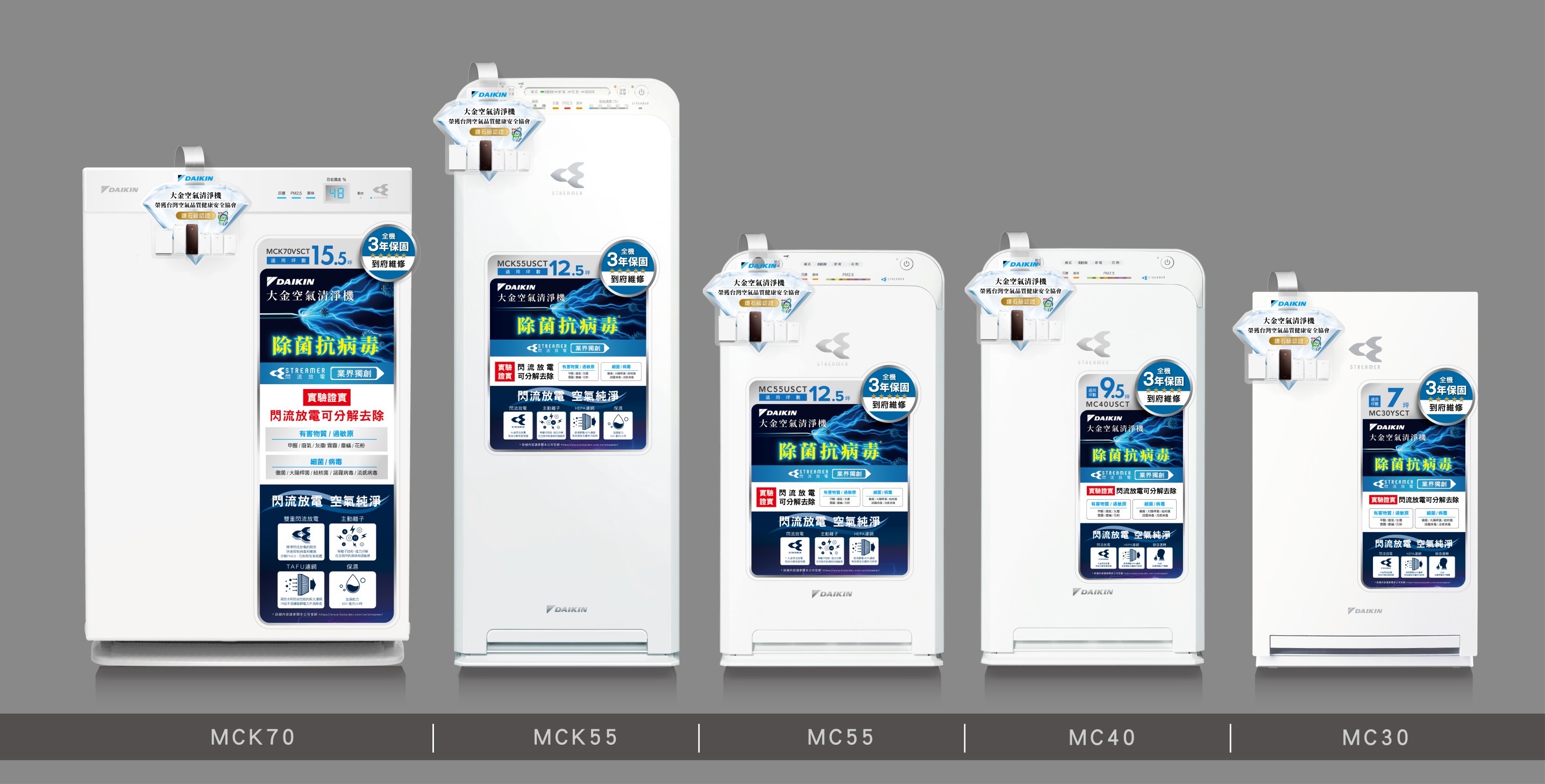 大金空氣清淨機全系列採用日本最先進閃流放電技術,本次榮獲最高等級鑽石級認證的共有8款型號:MC40USCT(白)、MC55USCT(白)、MC40USCT7(白)、MC55 USCT7(白)、MCK70VSCT-W(白)、MCK55USCT-W(白)、MCK55USCT-T(棕)、MC30YSCT(白)。
