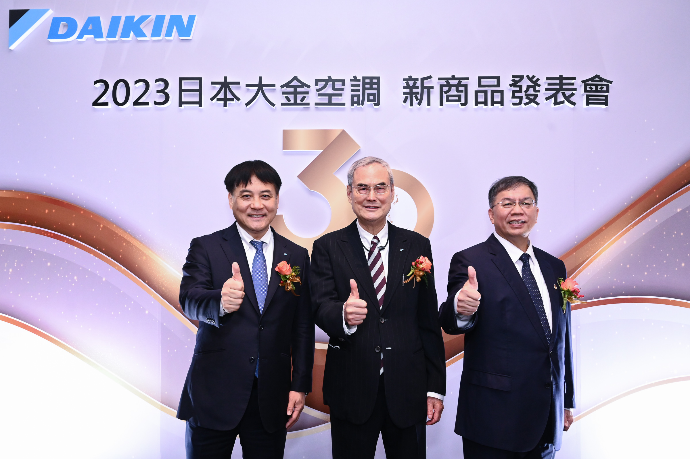 ![]() 2023和泰興業代理大金空調30週年暨新品發表會儀式(左二起)DIT取締役社長 大森淳一、大金工業全球戰略本部 本部長 上原章司、和泰興業董事長 蘇一仲、和泰興業總經理 林鴻志及全球大金集團貴賓 | ![]() 2023和泰興業代理大金空調30週年暨新品發表會儀式(左起)大金工業全球戰略本部本部長上原章司、和泰興業董事長蘇一仲、和泰興業總經理林鴻志 |
