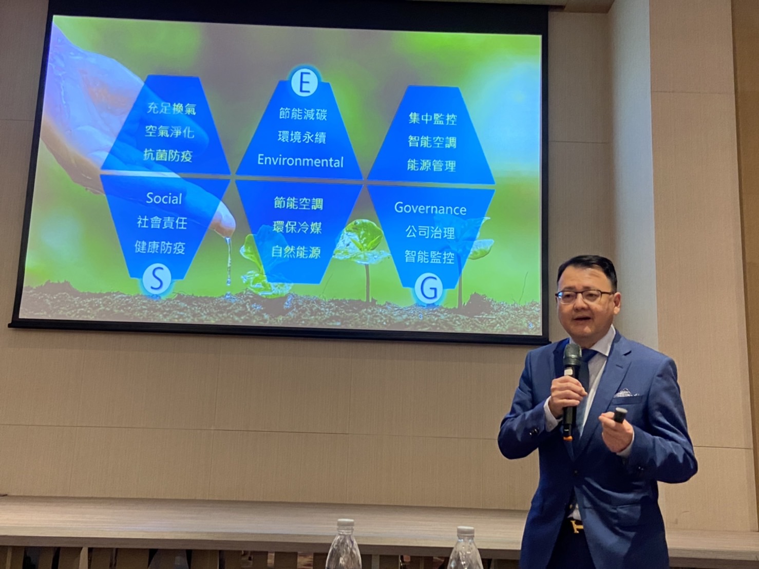 大金空調台灣總代理-和泰興業於4月14日在高雄萬豪酒店舉辦「企業實踐ESG 和泰大金因應方案研討會」,提出大金如何應用高效節能的冰水主機、健康防疫抗菌的空氣側產品及配合智慧型AI中央監控系統,來協助各產業輕鬆實踐ESG。