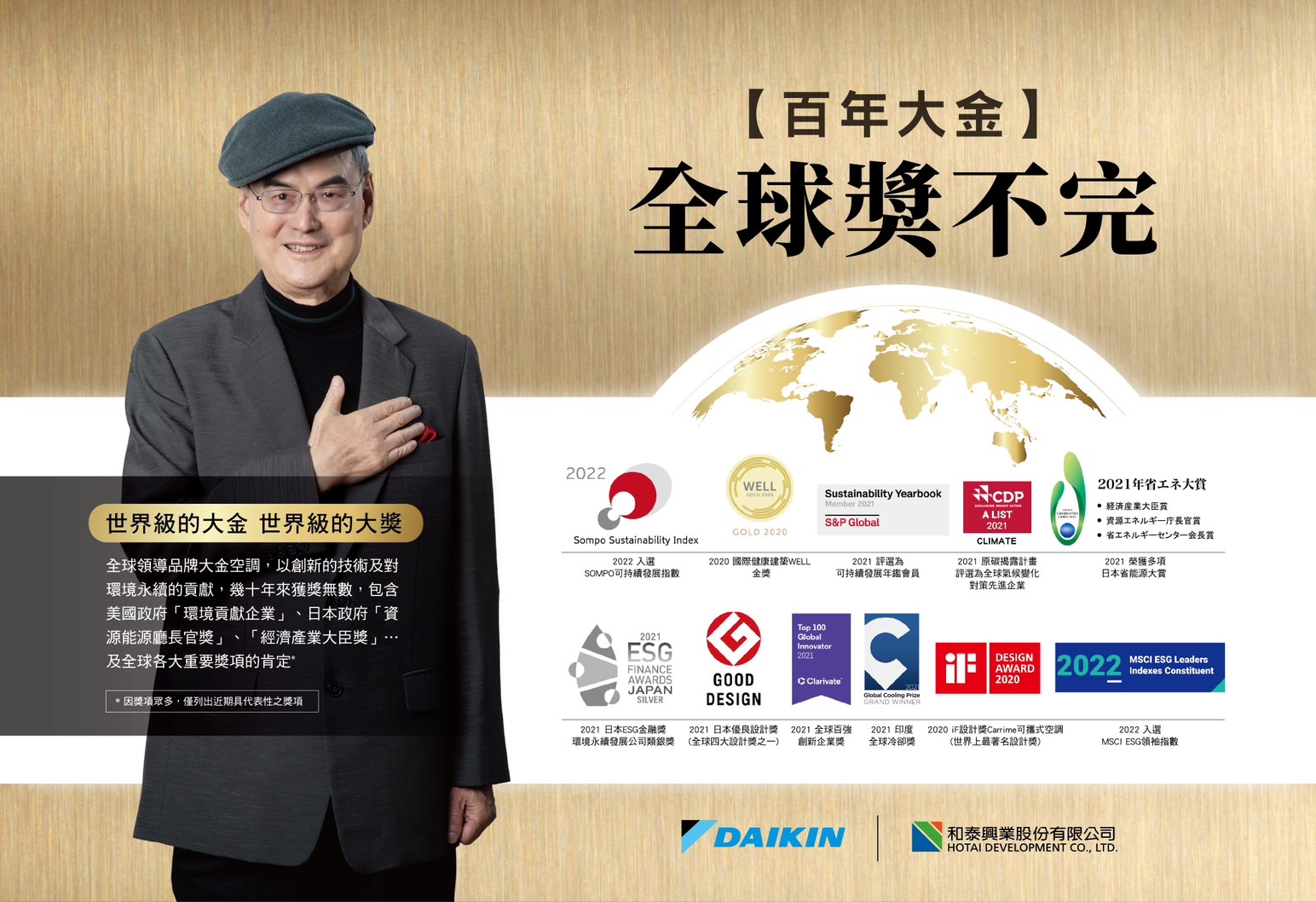 身為全球變頻領導者,大金空調自我挑戰,在環保、科技、省能源、商業設計、健康品質與品牌形象等,近年來屢獲日、義、法、英、澳、美等各國空調大獎肯定。