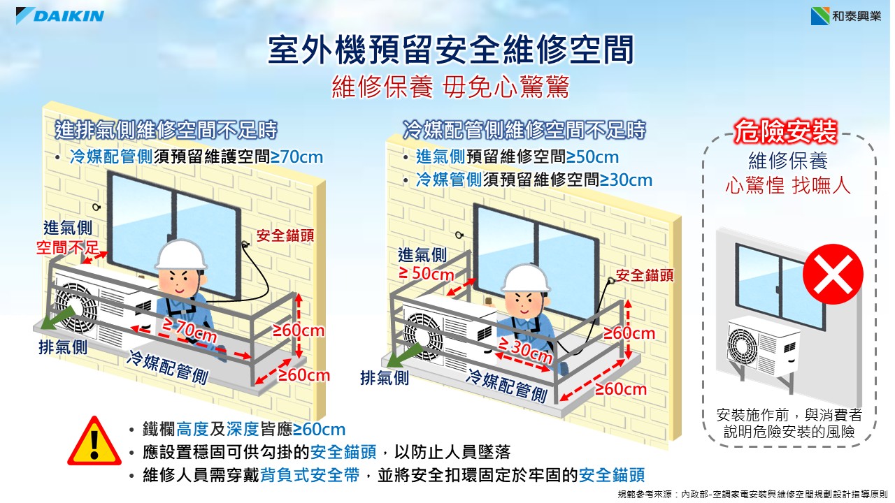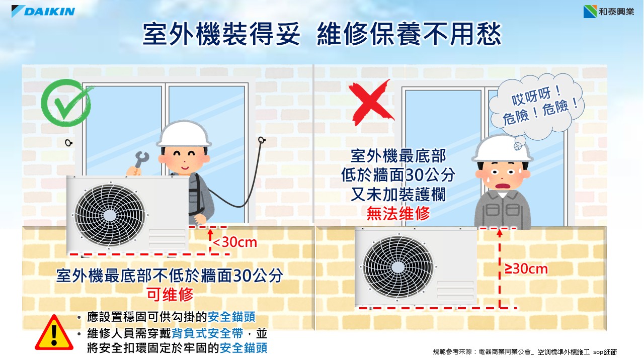 室外機安裝位置與方式,必須兼顧未來保養維修的安全性,以避免後續檢修困難或安全疑慮。