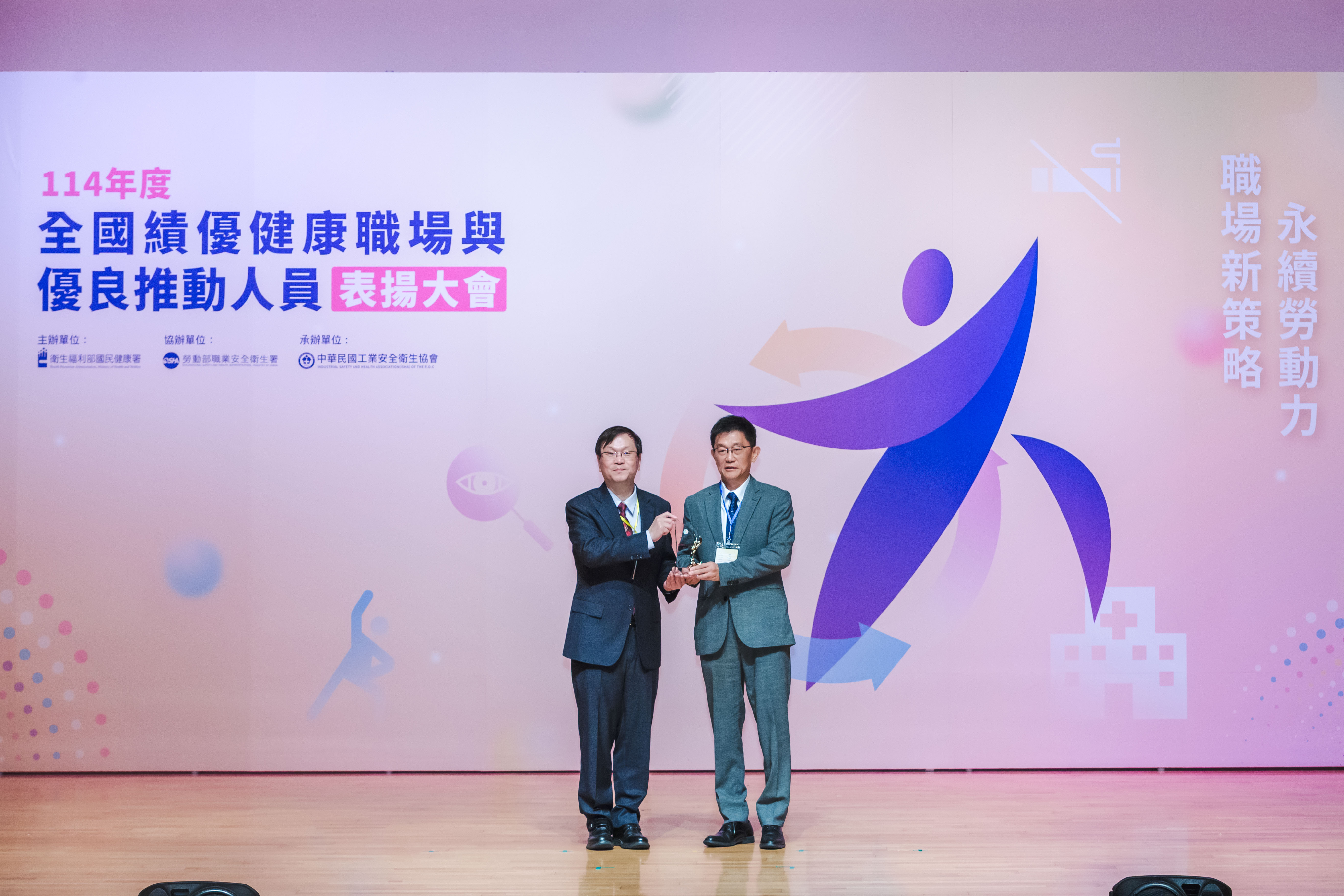 衛生福利部常務次長莊人祥(左)頒獎和泰大金總經理陳永澤