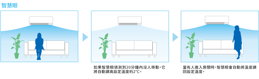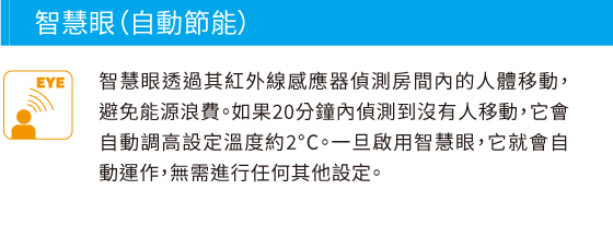在空調冷房運轉時,大多數耗電是由於降低房間溫度所造成的。如果您降低設定溫度2°C,耗電就會約增加20%。請 先嘗試高風速或除濕運轉,再考慮降低設定溫度。