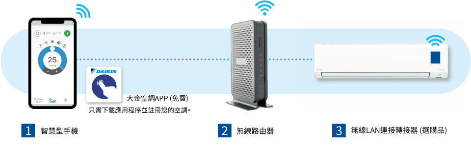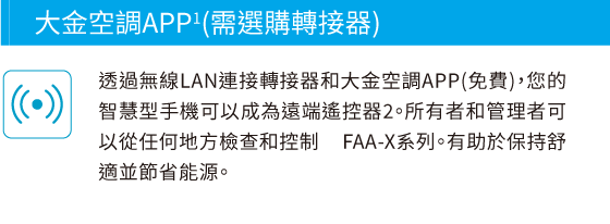 1. 使用大金空調APP對空調進行室內控制將取決於您區域網路的有效覆蓋範圍。