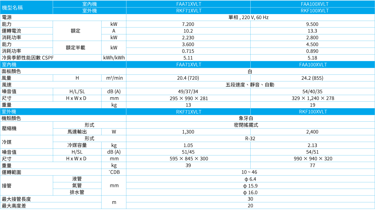 1. 冷房能力是依據:室內溫度27˚CDB, 19˚CWB; 室外溫度35˚CDB;配管長度7.5m。