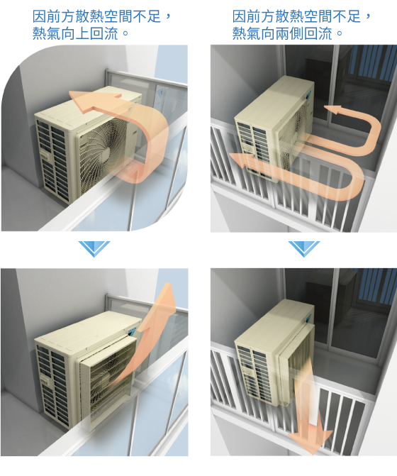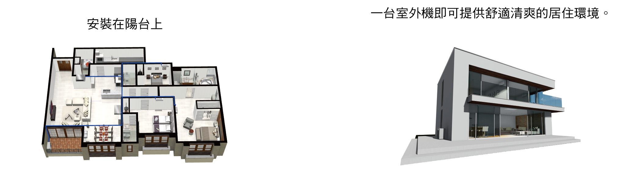 - 採用新的外殼設計,所有機種的高度降低到僅870 mm。 低機身的外殼設計為住戶提供了一覽無遺的景觀視野,陽台 使用面積最大化。