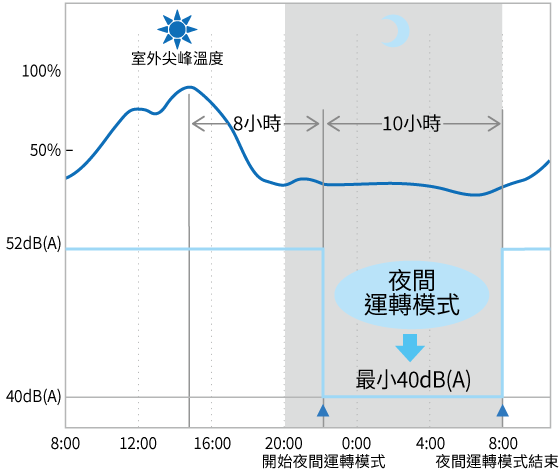 - 夜間靜音運轉功能,透過減少運轉能力來自動抑制夜間運轉噪音,保持安靜環境。