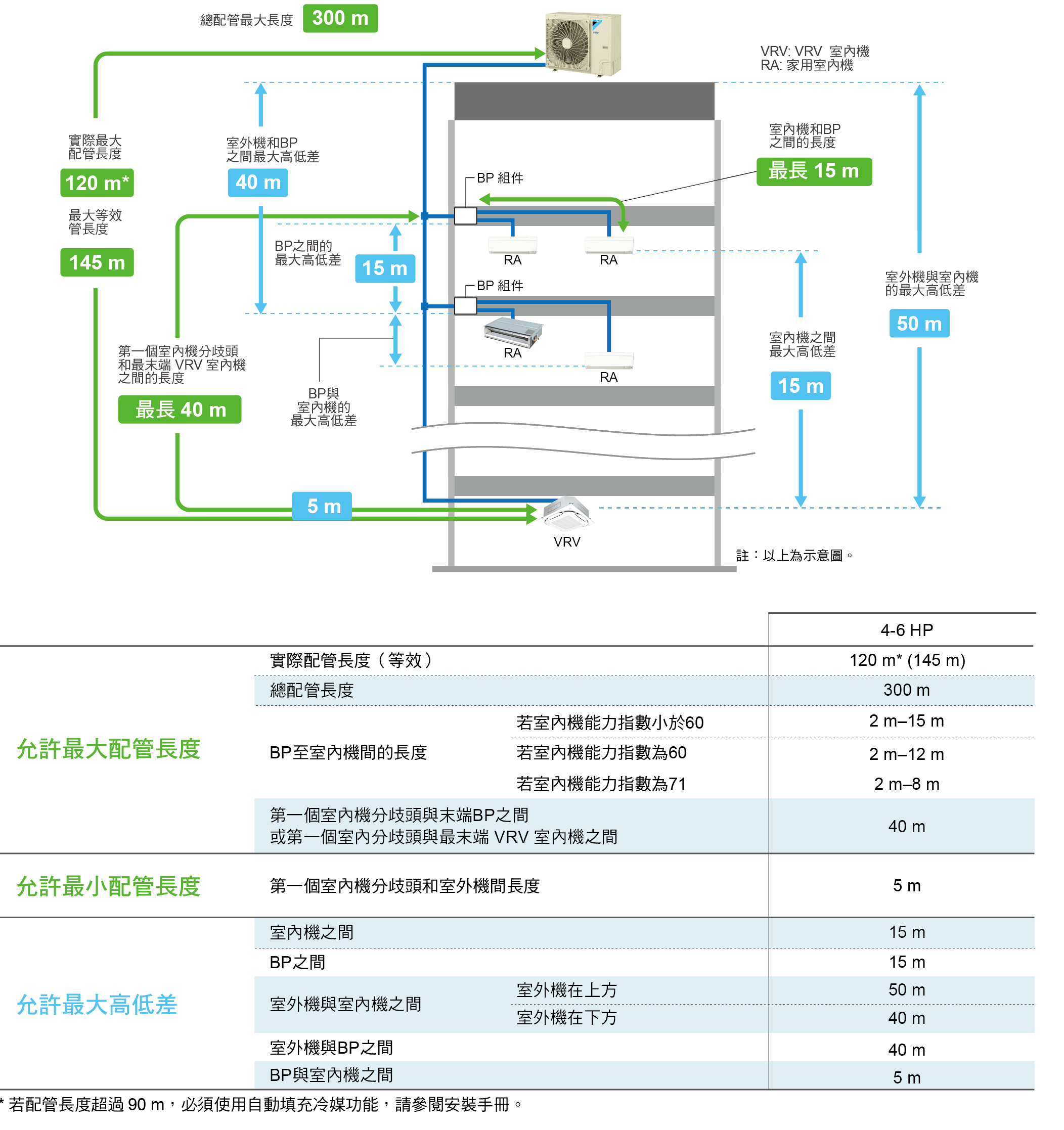 2、VRV與家用室內機混合連接或僅連接家用室內機時,可連接的室內機的總能力指數必須為室外機的能力指數的80%-130%。
