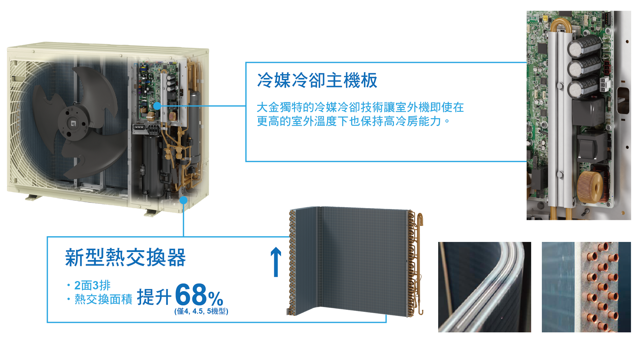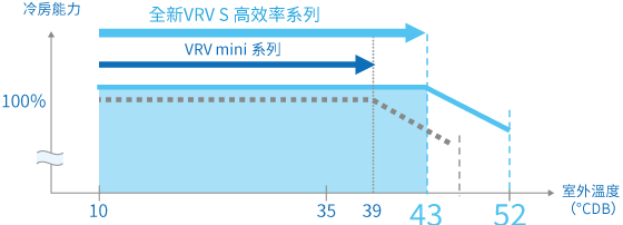 - 因為有更大的熱交換器,在高達 43°C 的室外高溫下仍可保持額定能力。