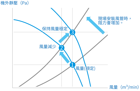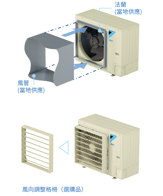 - 高達 40 Pa 的機外靜壓,在小型安裝場所也可以穩定運轉。使用風向調節格柵(選購品)或風管(當地供應)以避免短循環。