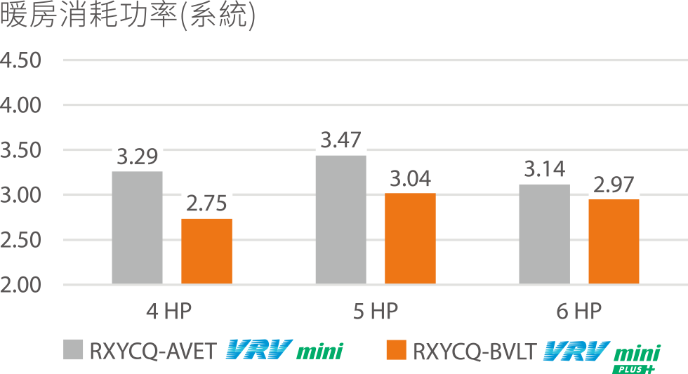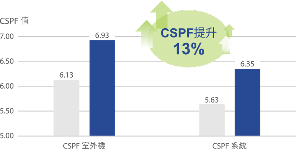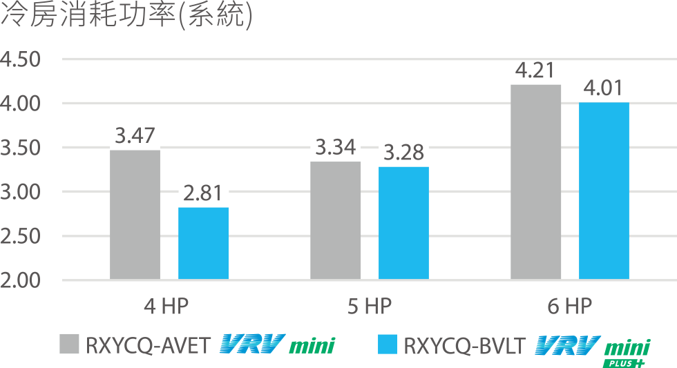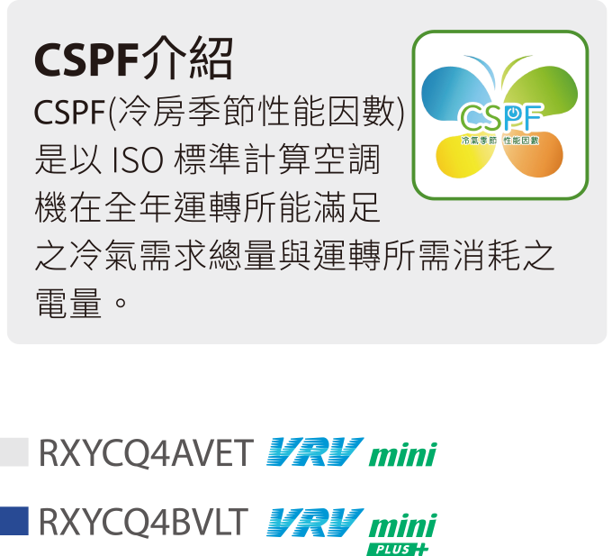 全新 VRV mini plus+ 系列符合國際 ISO 的 CSPF* 標準。不僅在低負載期間降低功耗,且在峰值負載期間具有更好的冷房能力。