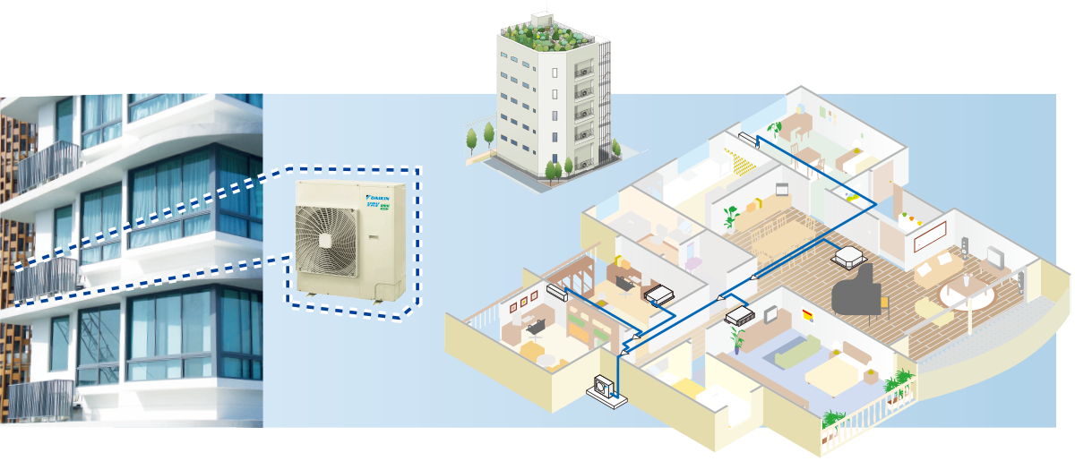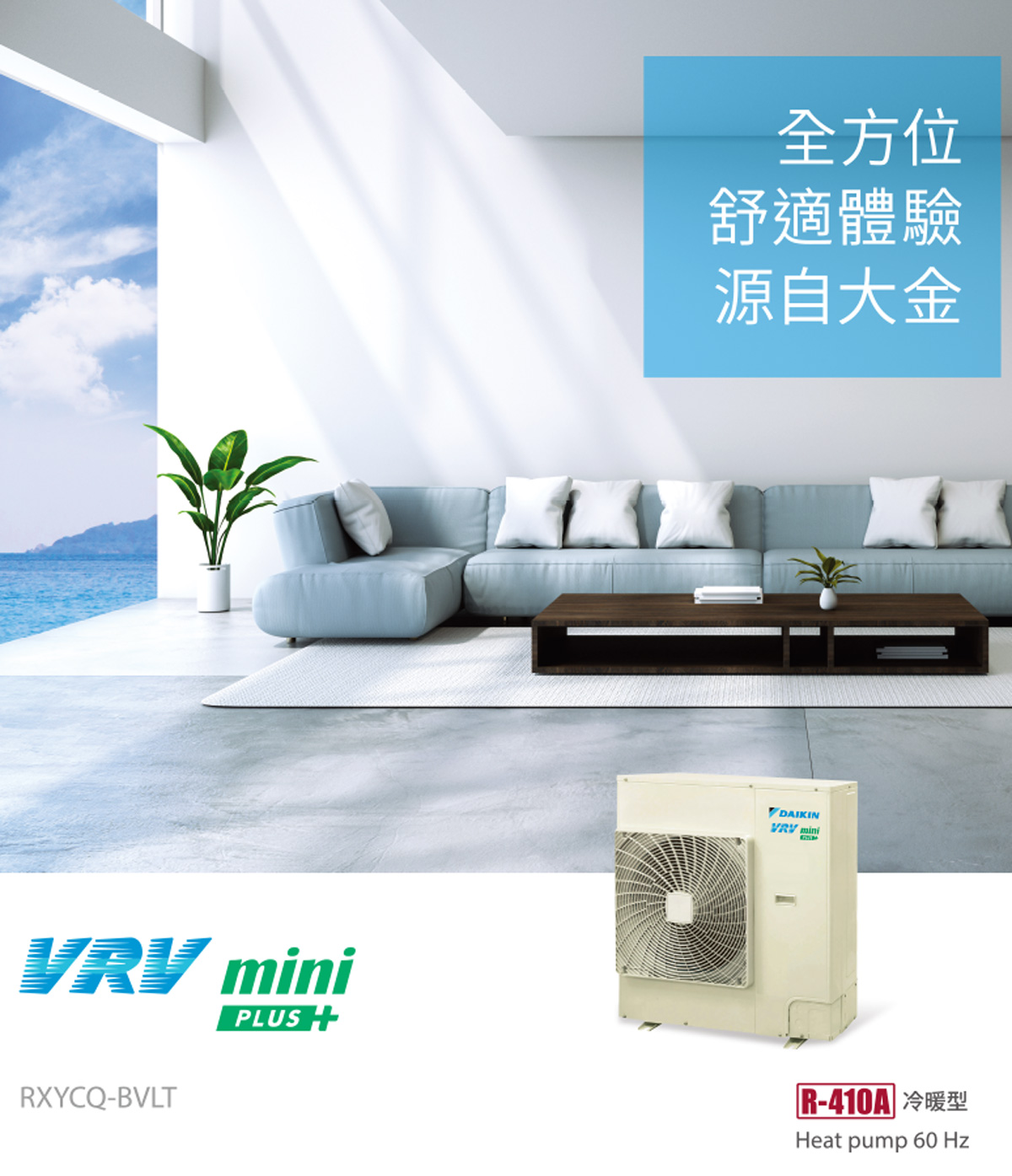 VRV mini plus+ 一台室外機即可連接多台室內機。具高度靈活性,可在同一冷媒迴路中連接不同形式的室內機來搭配裝潢,並符合冷房需求。