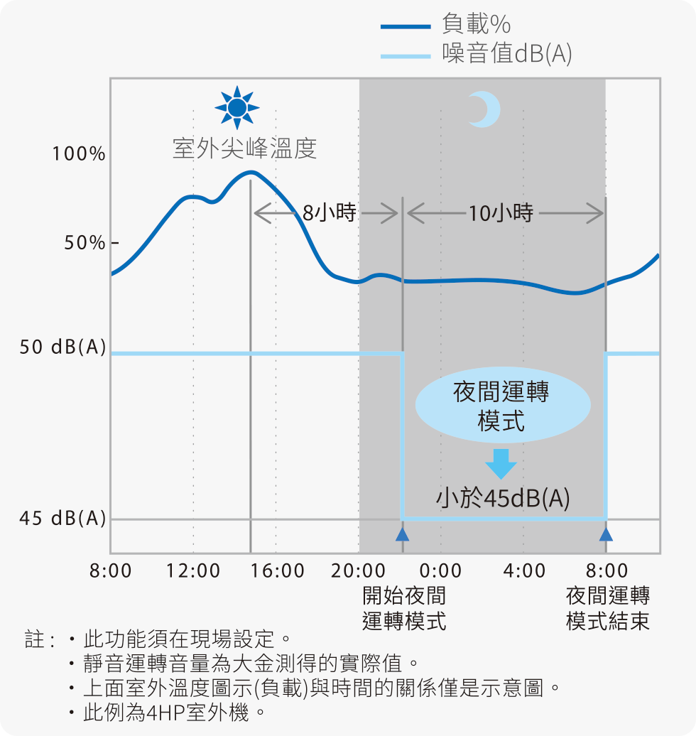實際運轉時,由於周圍環境條件影響,噪音值比標準稍高。當擔心周圍環境(例如住宅)的噪音時,我們建議調查安裝位置並採取隔音措施。