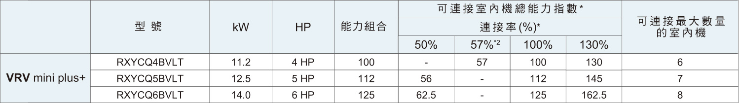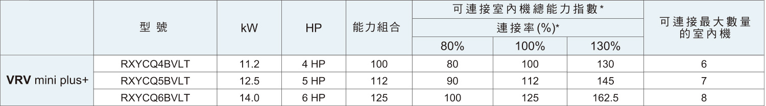 註:可連接的室內機的總能力指數必須為室外機的能力指數的80%–130%。