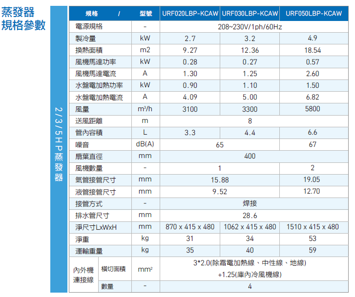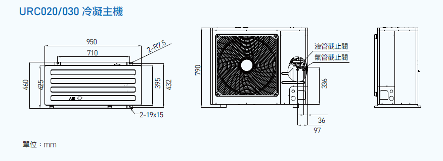 2. 機組外型尺寸說明:寬度不含底腳長度,高度不含排水管高度。