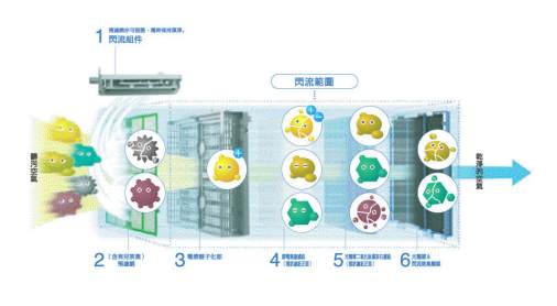 風吸附空氣中物質後,輔以光觸媒及閃流脫臭觸媒強力