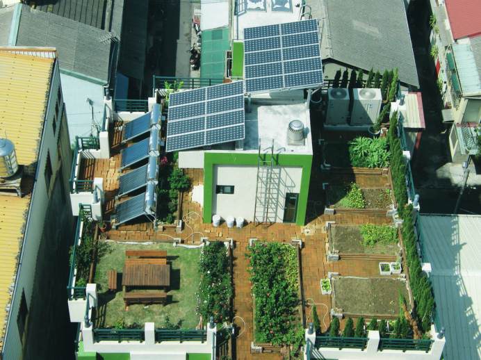 從空中俯瞰林宅樓頂,太陽能光電系統及太陽能熱水器、大金空調系統皆一目了然。
