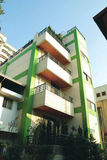 外觀樸實的林宅,配合門前綠樹以綠色為主調,為名