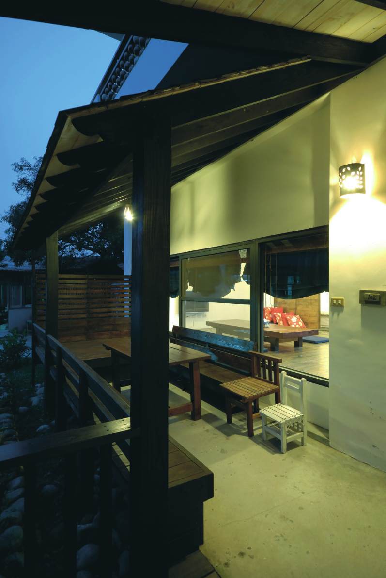 劦陶宛的民宿環境清幽,餐廳前廊的水池中有鯉魚漫