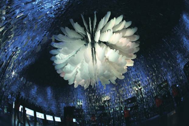 夢想館上方懸掛寬達六公尺的機械花朵,並搭配上周